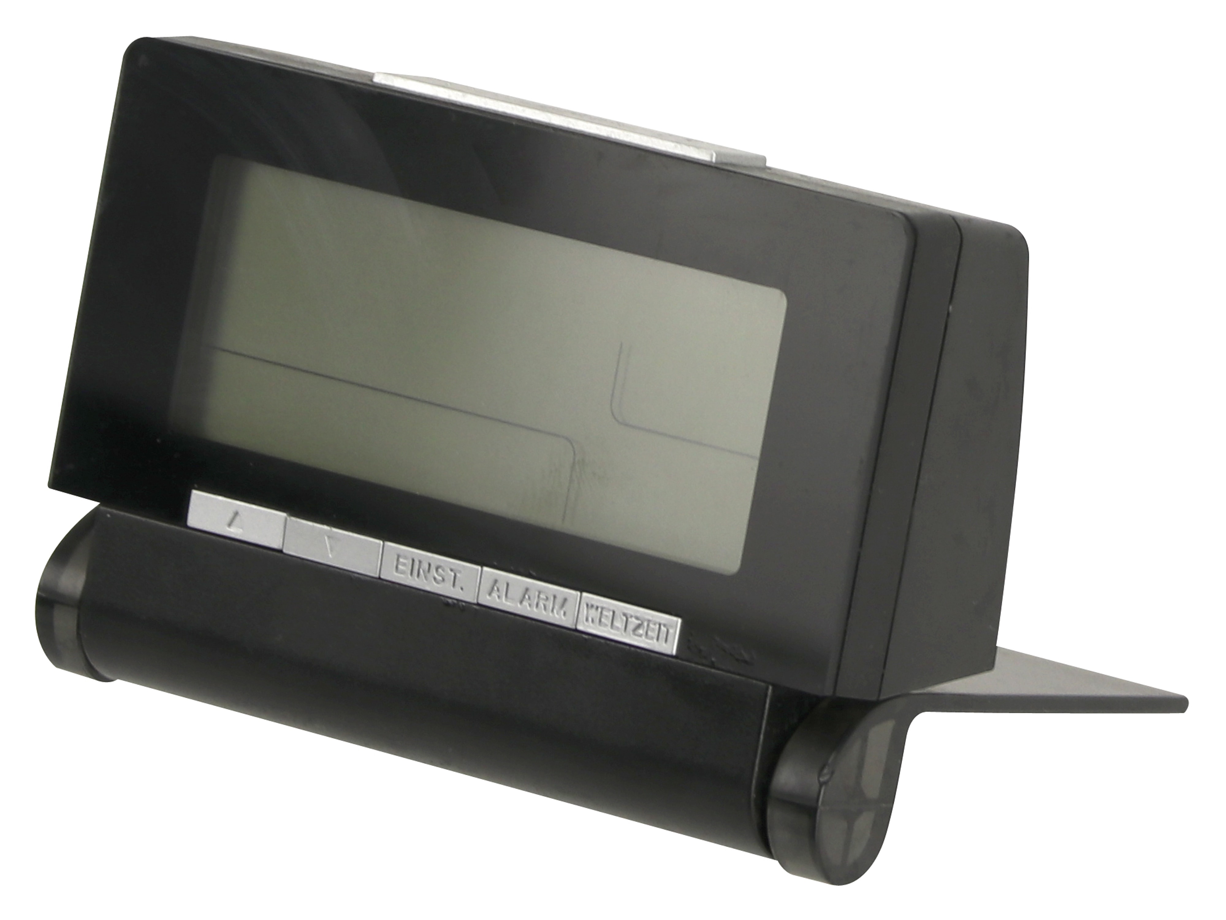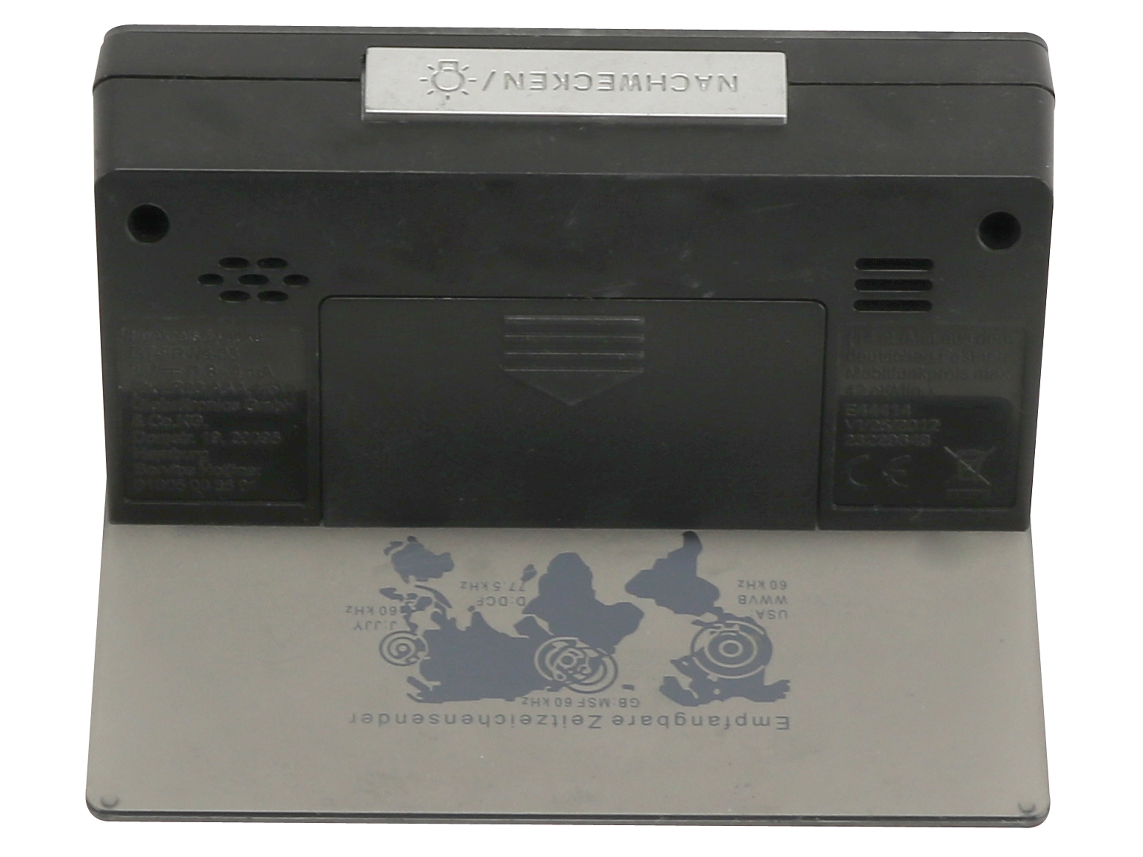Kompakter Funkreisewecker mit Klappfunktion für mehrere Zeitzeichensender. Die Verpackung wurde zum Entfernen der abgelaufenen Batterien geöffnet, das Gerät ist neu und unbenutzt.