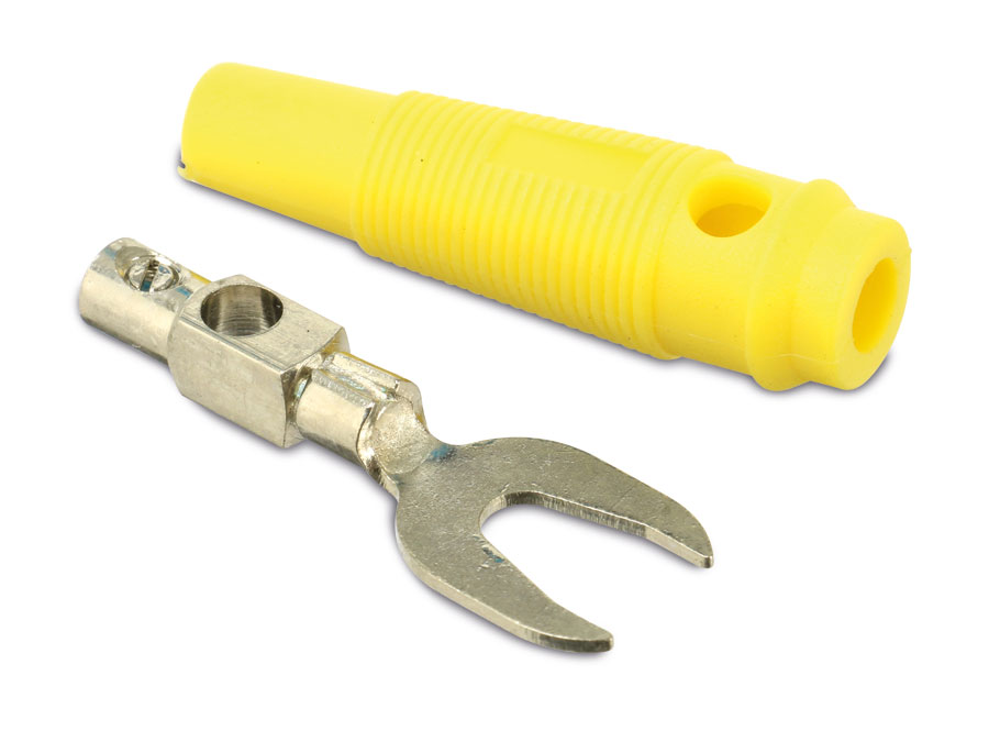Gabelkabelschuh mit trittfester Hülle, 4 mm Querloch und Schraub-/Lötanschluss.