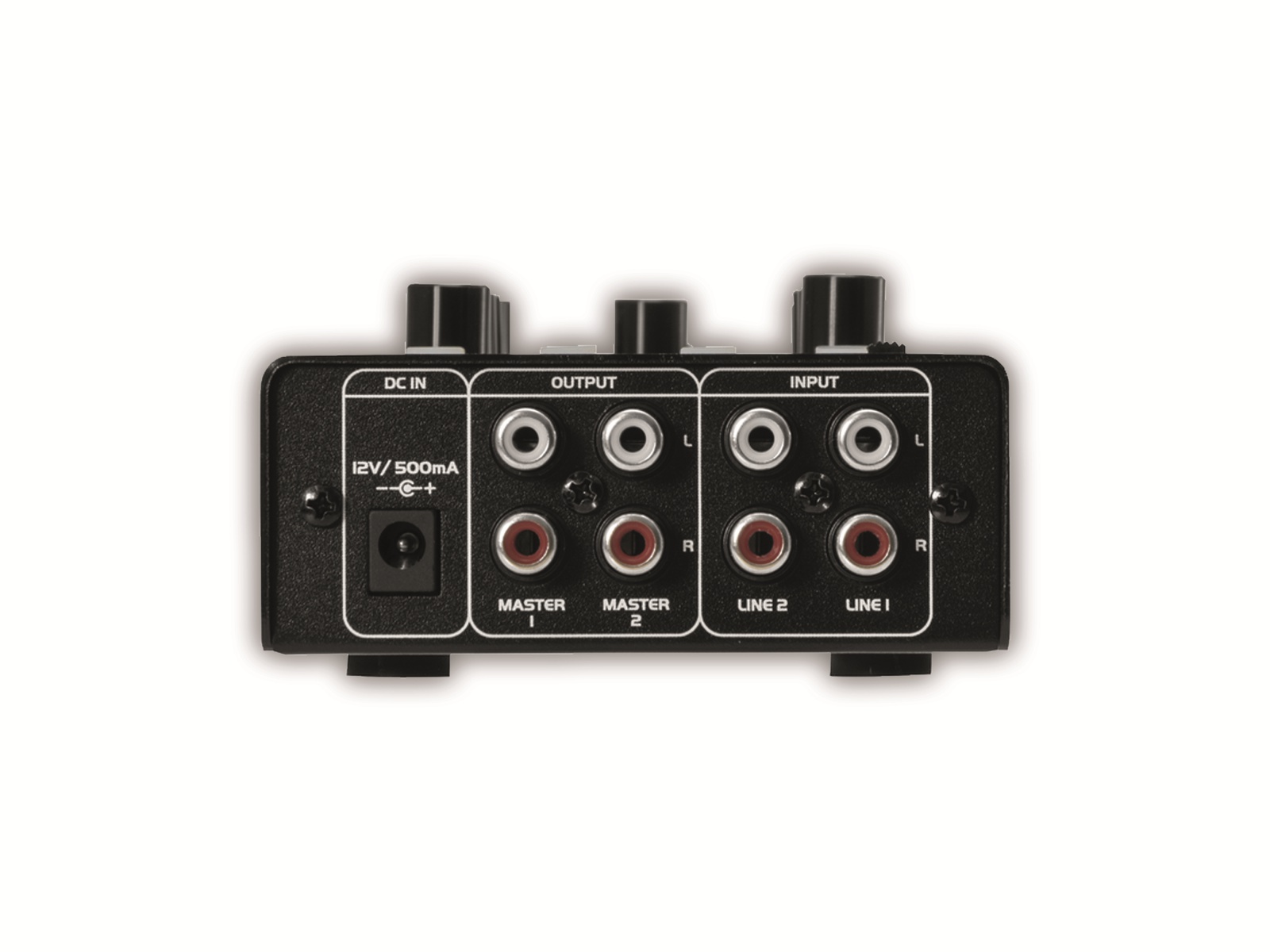 - 2 Stereokanäle mit Gain-Regler und 2-Band-EQ, Anschluss über Cinchbuchsen