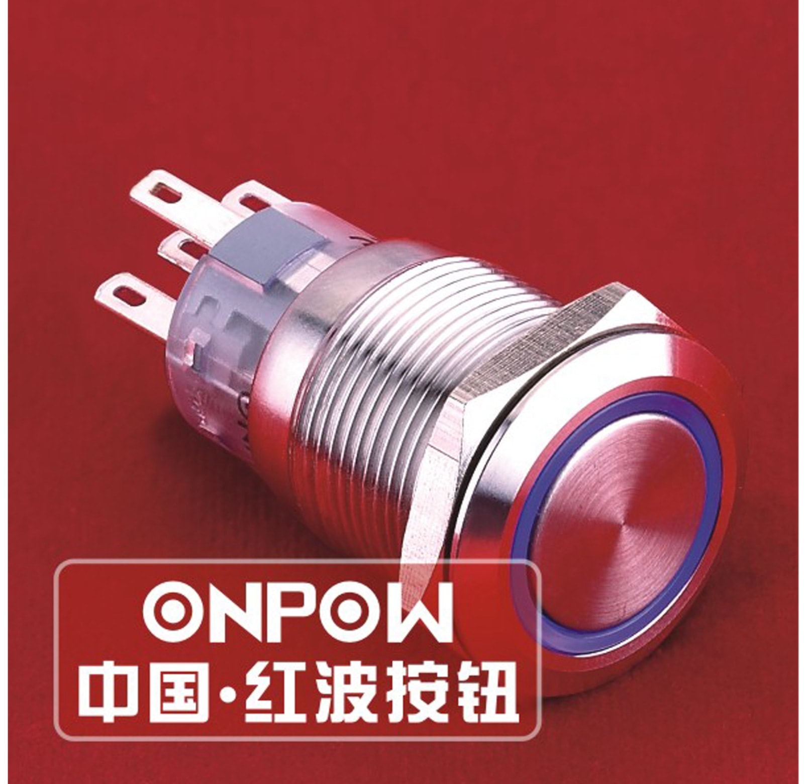 Produktinformationen "ONPOW Schalter, 24 V/DC, 1x Off/On, Beleuchtung blau, Lötanschluss, flach rund, Edelstahl, 16 mm"